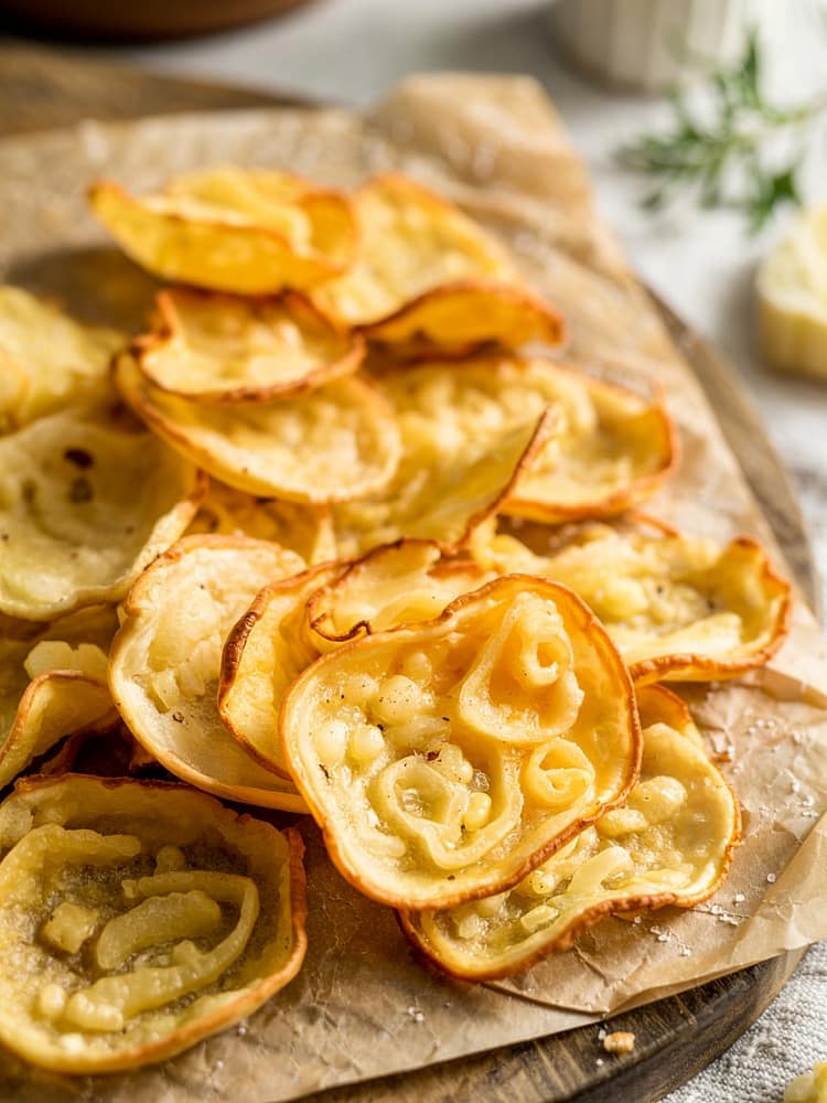 These chips are known for their lace-like appearance and crispy, bubbly texture. As the cheese melts, it spreads and forms delicate holes similar to those found in parmesan crisps. The edges brown beautifully, adding nutty flavor and crunch.