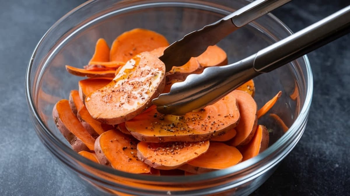 Slice the sweet potatoes as thinly as possible using a sharp knife or a mandoline slicer. Aim for uniform thickness (about 1.5 mm) to ensure even cooking.