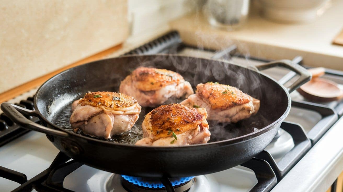- Heat the olive oil in a large skillet or cast-iron pan over medium-high heat. Once the oil is shimmering, place the chicken thighs skin-side down in the pan.