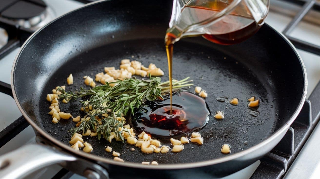 In the same skillet, reduce the heat to medium and add minced garlic. Sauté for about 1 minute until fragrant. Pour in the balsamic vinegar and honey, stirring to combine. Add the chopped rosemary, salt, and black pepper. Let the mixture simmer for 5 minutes until it thickens slightly.