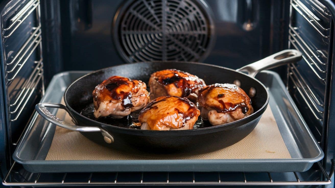 Return the seared chicken thighs to the skillet, skin-side up, ensuring they are well-coated with the balsamic glaze. Transfer the skillet to a preheated oven at 200°C. Bake for 20 minutes, allowing the glaze to caramelize and the chicken to cook through.