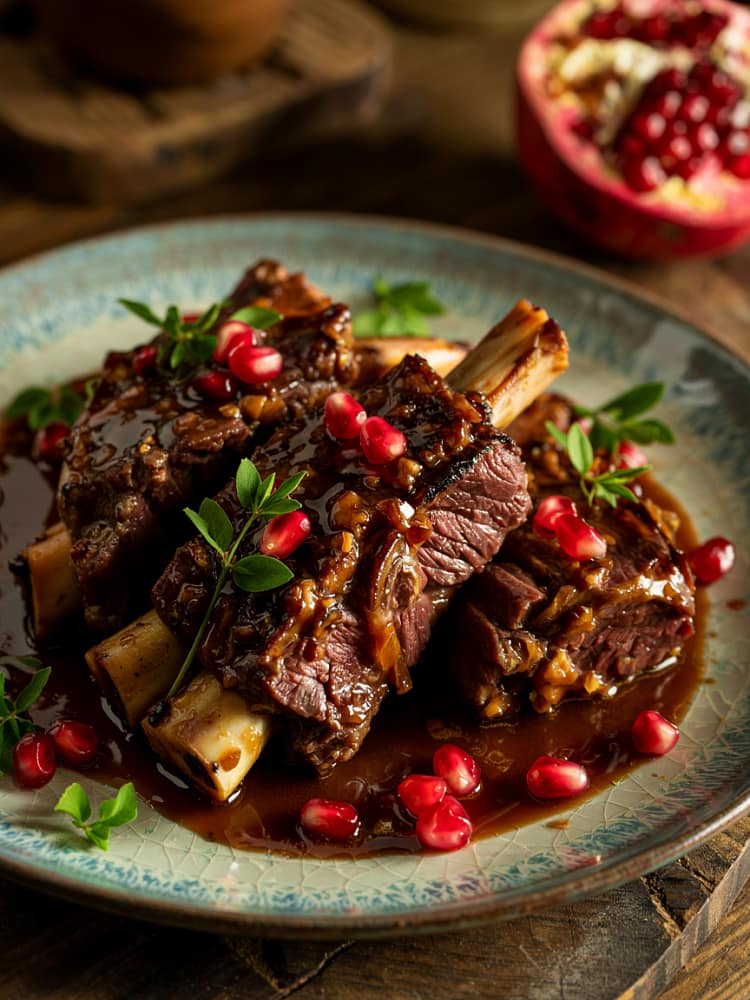 For this dish, the pomegranate reduction doesn’t just tenderize the beef—it infuses it with subtle fruity brightness, elevating the classic braised short rib.