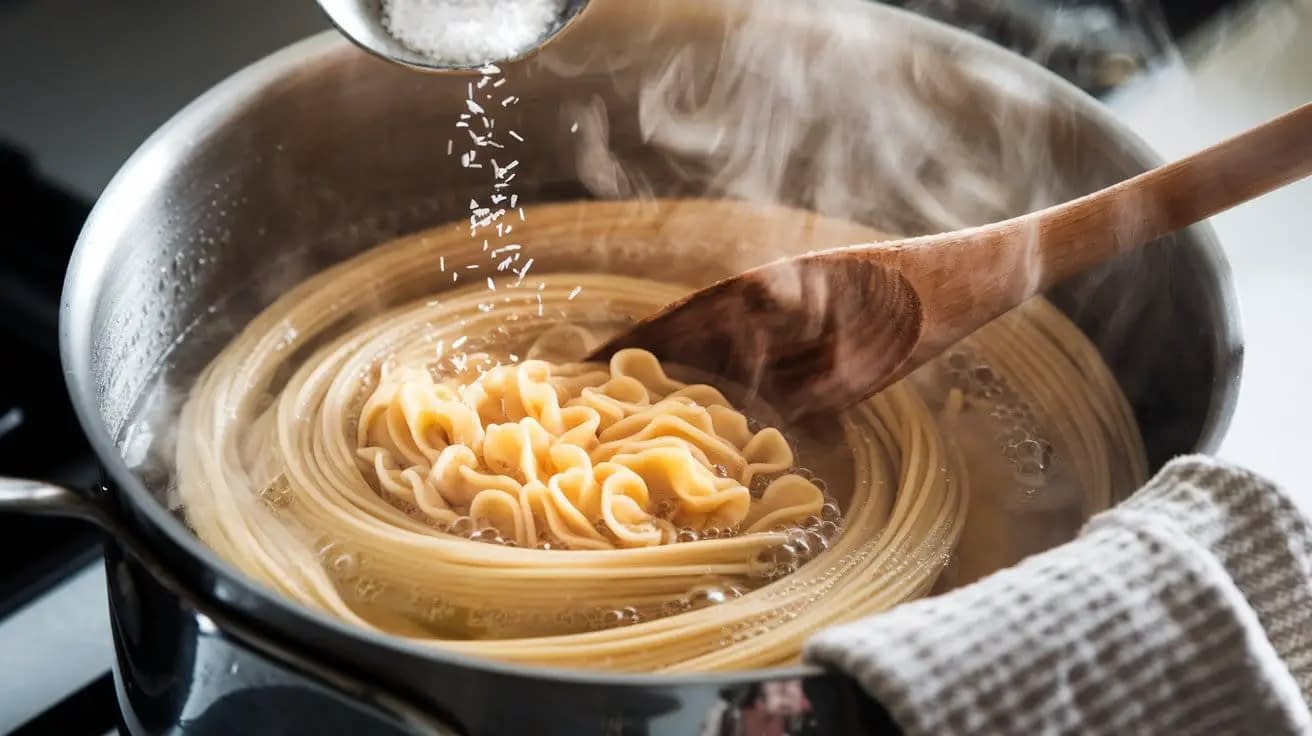 - Meanwhile, boil water in a pot, add salt, and cook egg noodles according to package instructions (about 6 minutes).