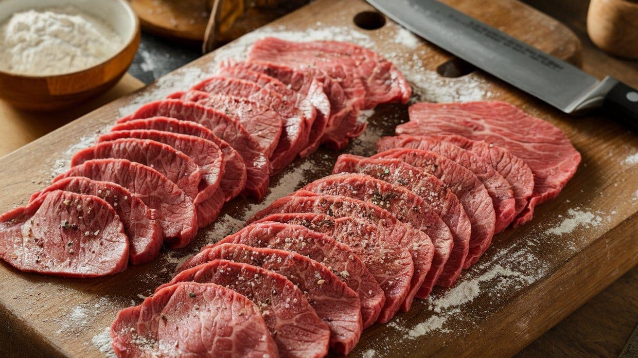 - Season the beef strips with salt and black pepper, then toss with flour to coat lightly.