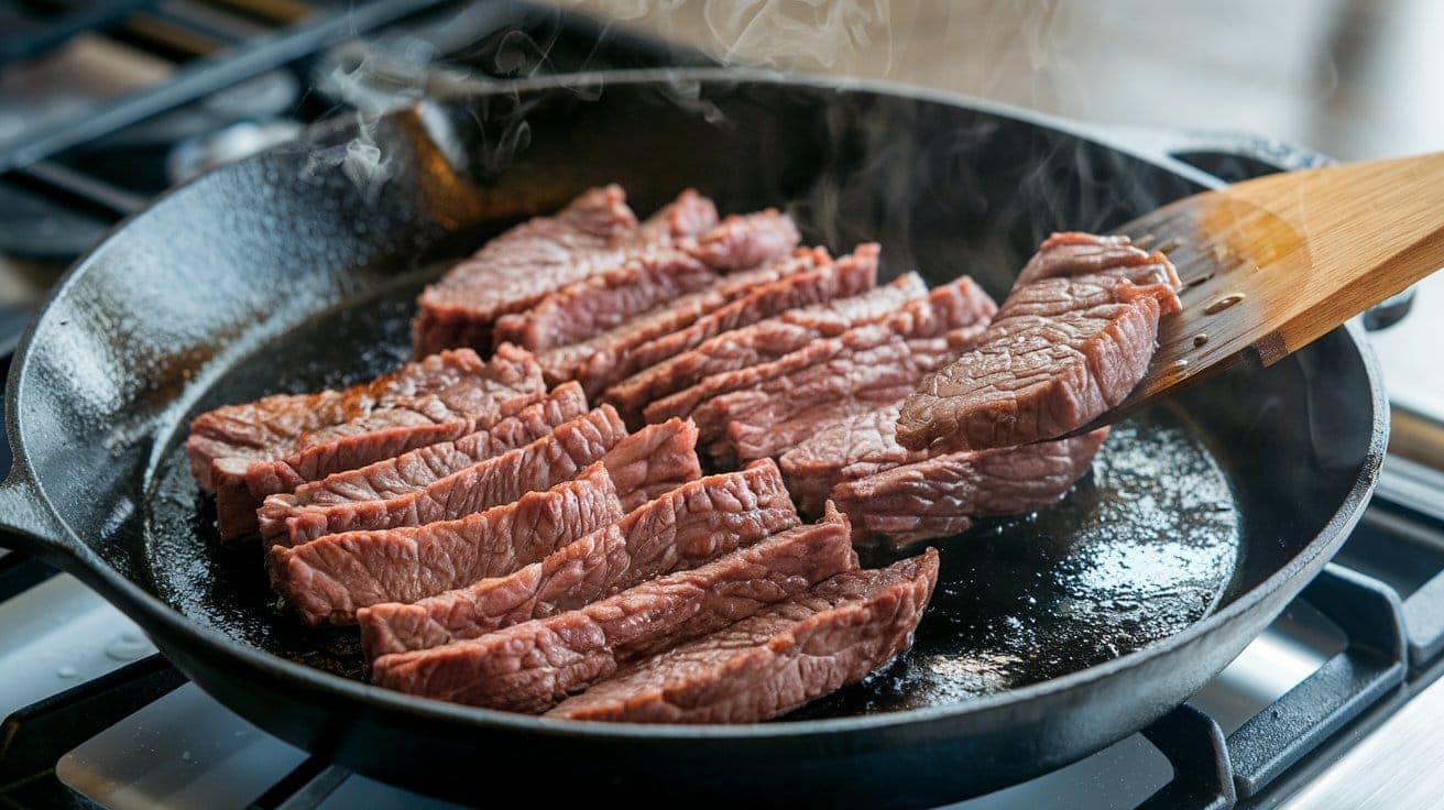 - Add the beef strips in a single layer and sear for 1-2 minutes per side until browned.