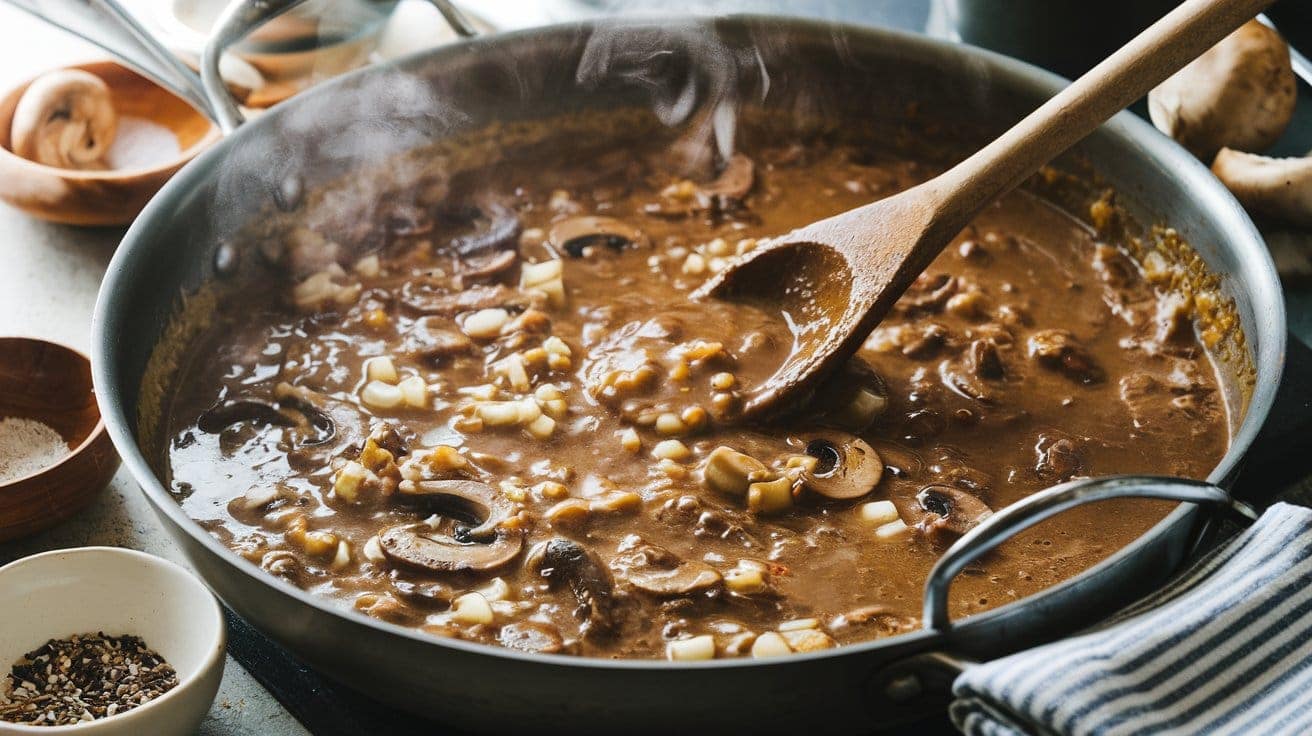 Sprinkle the flour over the mushroom and onion mixture, stirring well to combine. This will help thicken the sauce. Slowly pour in the beef broth while continuously stirring to avoid lumps. Bring the mixture to a simmer and cook for 5 minutes, allowing the sauce to thicken.
