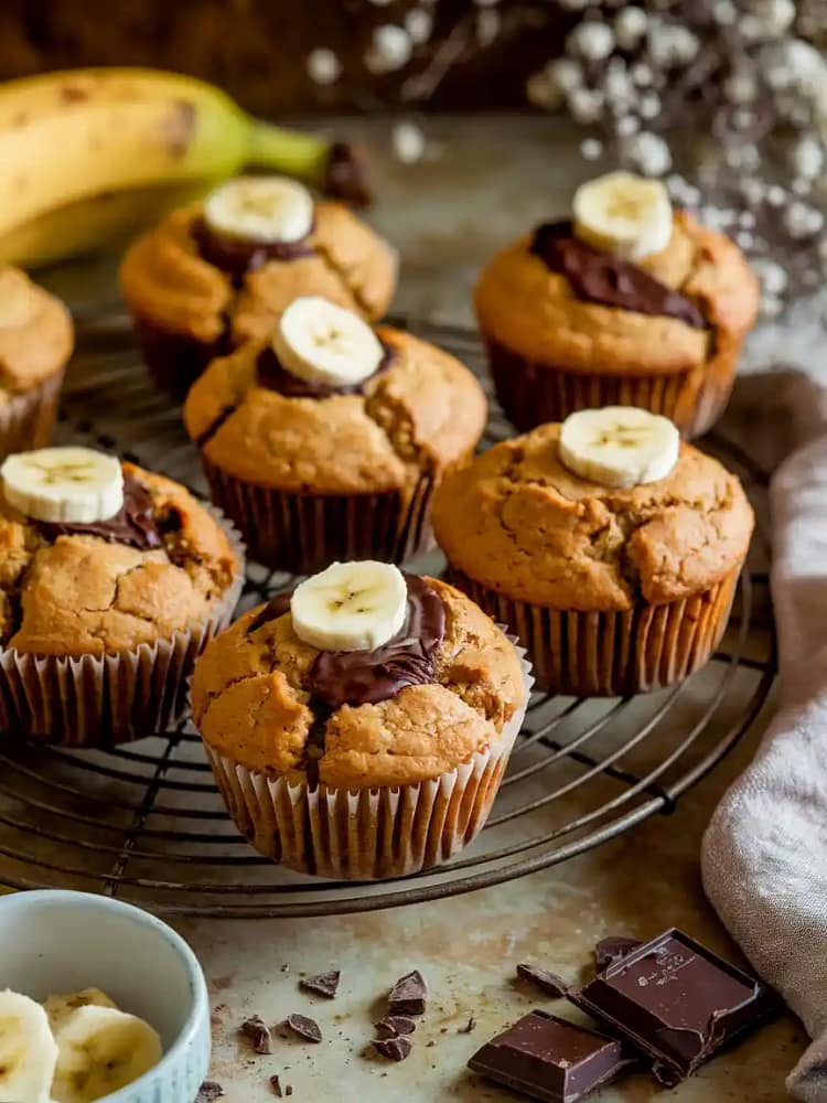 Divide the batter evenly among the 12 muffin cups. Garnish with extra chocolate or banana slices if desired.