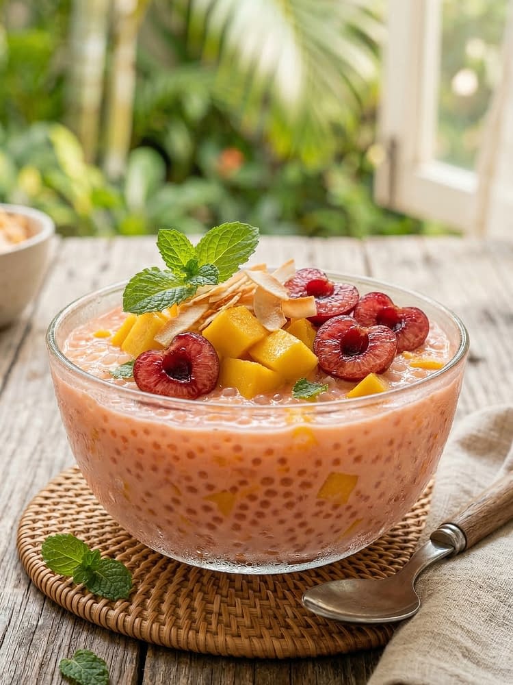 Sago desserts are widely enjoyed across Asia, especially in regions influenced by Chinese and Southeast Asian cuisines. The soft pearls absorb the creamy fruit mixture and create a texture that is both smooth and pleasantly chewy. When paired with naturally sweet fruits like mango and cherries, the dessert becomes bright, balanced, and refreshing.