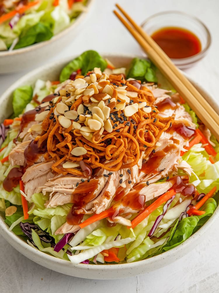 Sprinkle chow mein noodles, toasted almonds, and sesame seeds on top for added texture.
