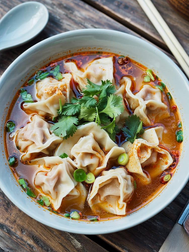 Ladle broth into bowls. Add 5–6 wontons per serving. Garnish with chopped cilantro, sliced green onions, and chili oil if desired. Serve immediately while hot.