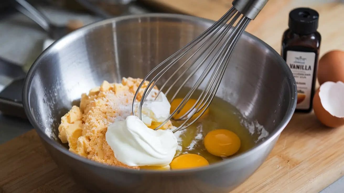 Beat in eggs one at a time, followed by sour cream and vanilla extract, mixing until smooth.