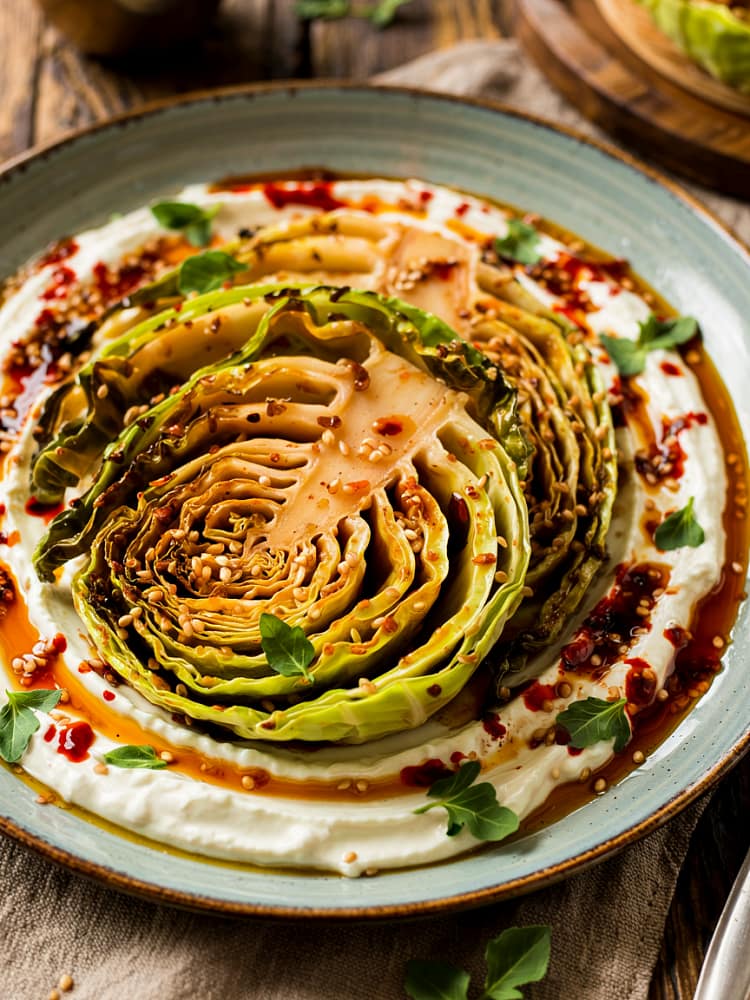 This Crispy Cabbage Steaks with Garlic Yogurt & Chili Oil recipe is proof that simple ingredients can create a dish that looks and tastes restaurant-worthy. The combination of deeply roasted cabbage, tangy and garlicky yogurt, and aromatic chili oil creates a balance of flavors and textures that will leave you coming back for more.
