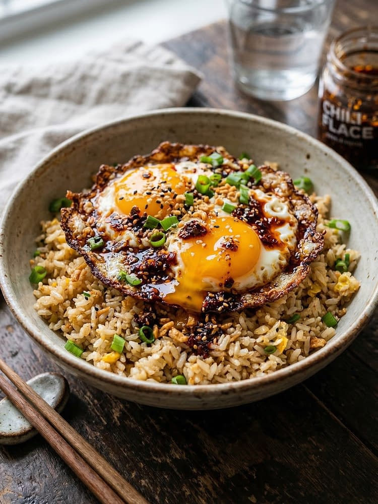Many rice dishes rely on complex sauces or long cooking times to develop flavor. Crispy Chili Oil Eggs with Garlic Rice achieves incredible depth with just a few carefully prepared elements.