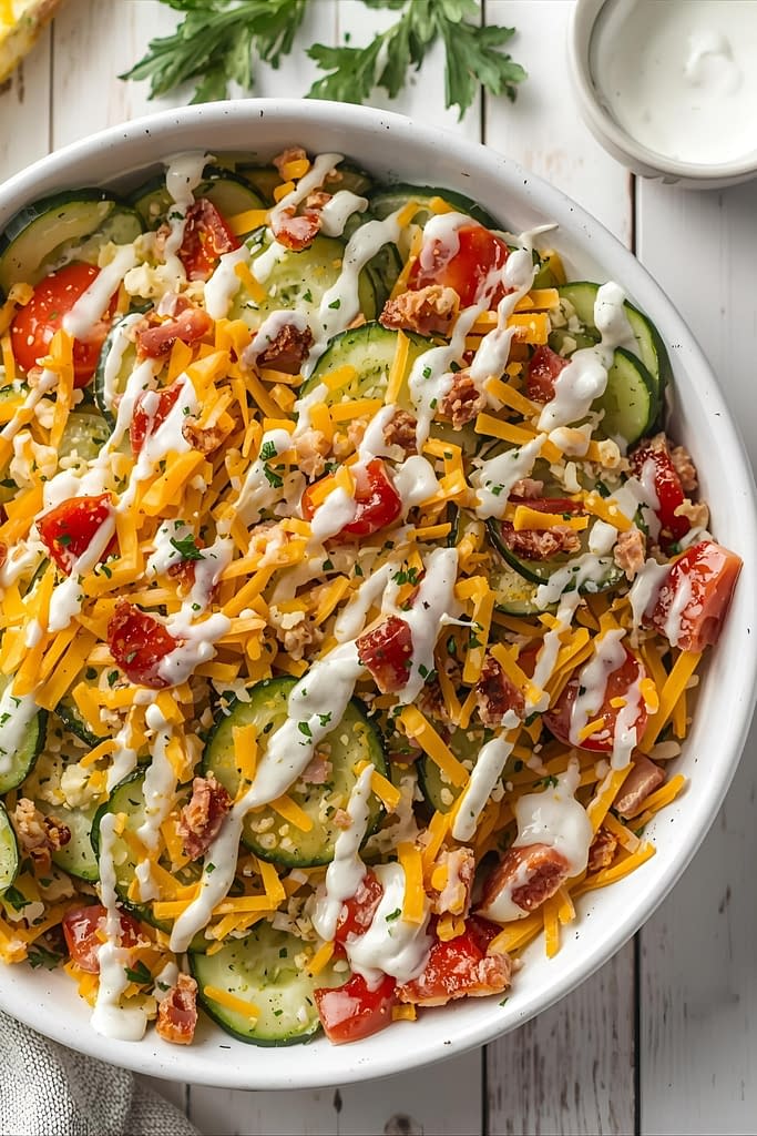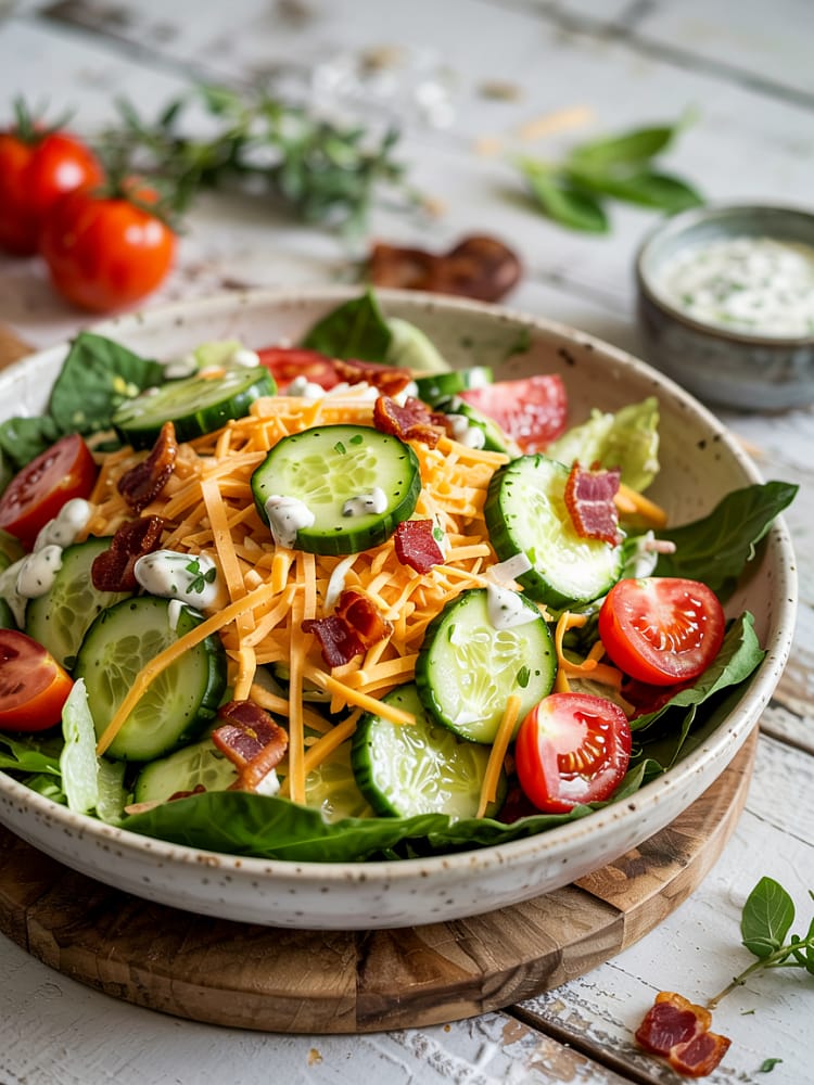 The Cucumber Ranch Crack Salad is proof that healthy doesn’t have to mean boring. With its creamy dressing, crunchy textures, and smoky notes from the turkey bacon, it strikes a perfect balance between refreshing and indulgent.