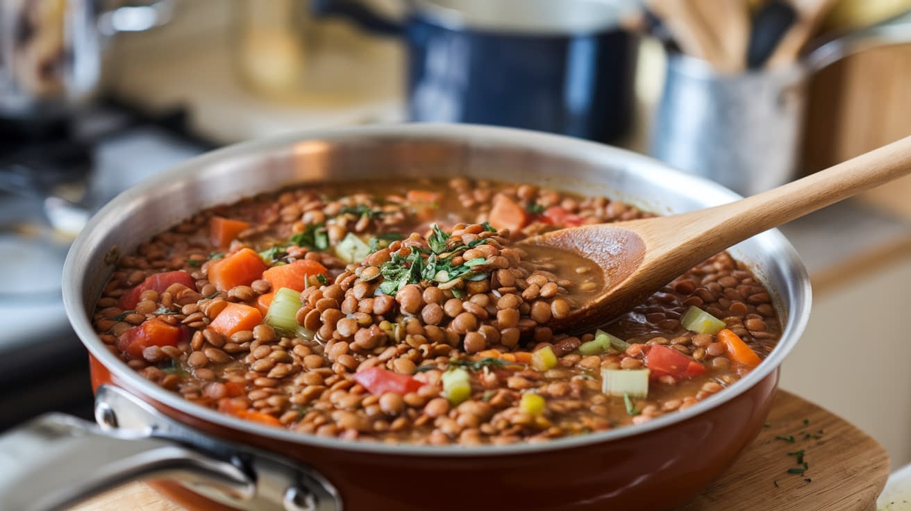 Add the cooked lentils and their cooking water to the pan. Stir well and simmer on low heat for 30–40 minutes, stirring occasionally. - Enrich with Butter and Cream