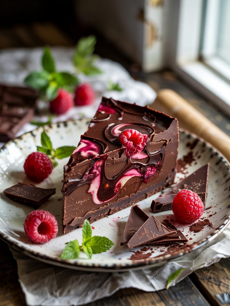 Before serving, top with chocolate curls, fresh raspberries, and mint leaves. Slice using a warm, dry knife for clean cuts. Serve chilled.