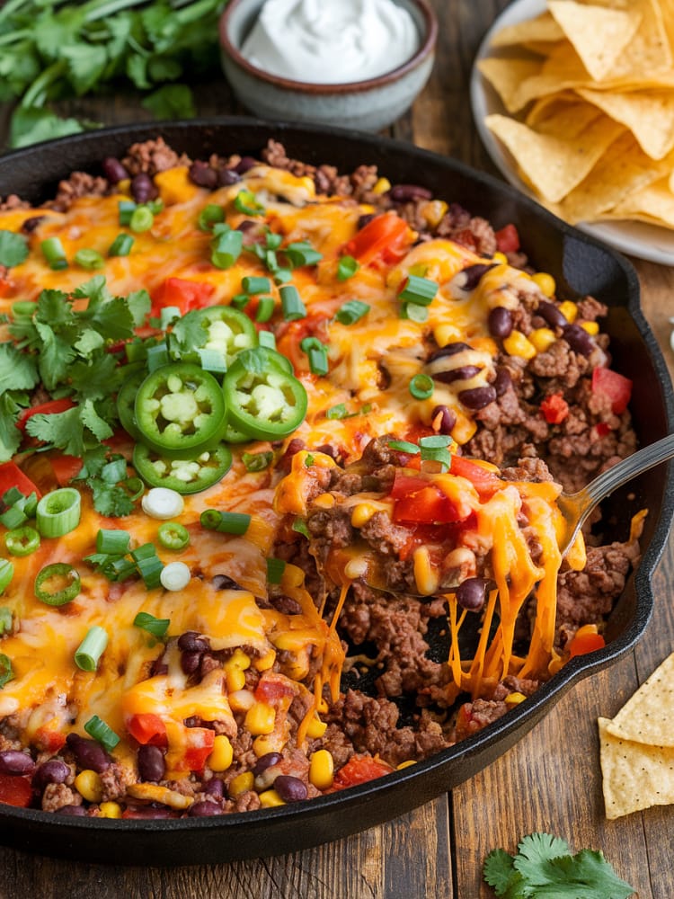 This Easy Beef Taco Skillet is a lifesaver for busy nights when you want a delicious, satisfying meal without a ton of effort. Packed with bold flavors, gooey cheese, and crunchy tortilla chips, it’s a recipe that will quickly become a household favorite. Plus, with endless ways to customize, you can make it your own every time you cook it.
