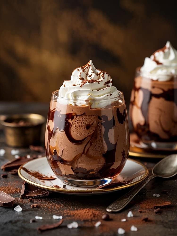 Before serving, top each mousse with a dollop of whipped cream, a pinch of flaky sea salt, and grated dark chocolate or a dusting of cocoa powder.