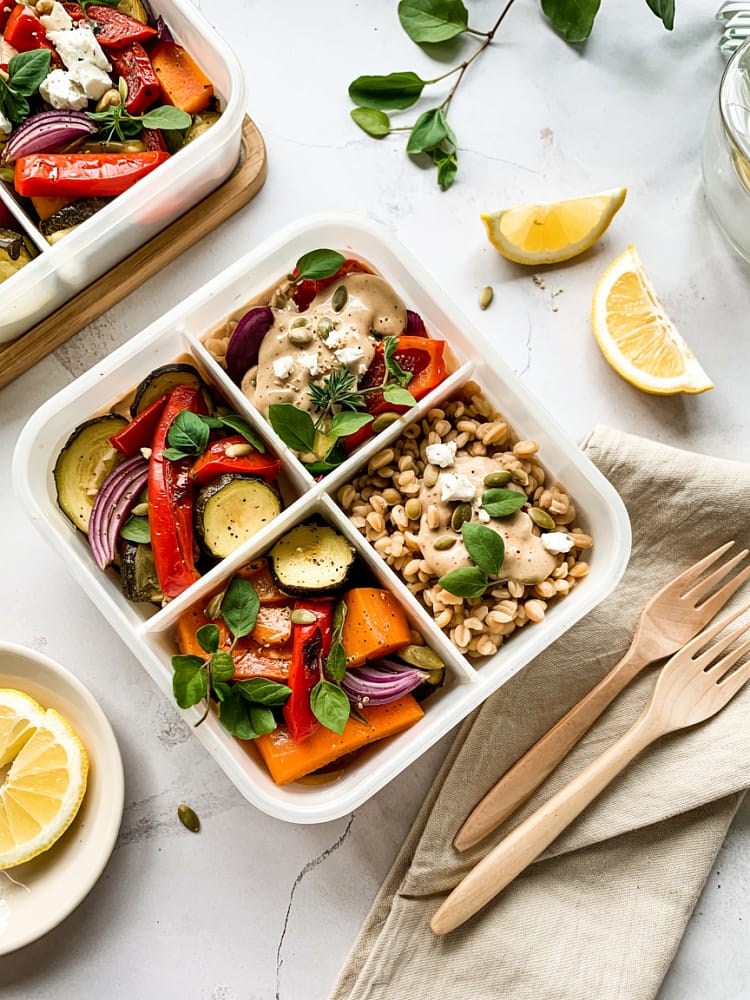 This hearty and wholesome Farro & Roasted Veggie Lunch Box is a healthy, meal prep–friendly recipe packed with roasted seasonal vegetables, nutty farro, and a zesty lemon-tahini dressing. Ideal for busy weekdays, this vibrant lunch box is plant-based, rich in fiber, and full of flavor, making it perfect for clean eating and keeping energized throughout the day.