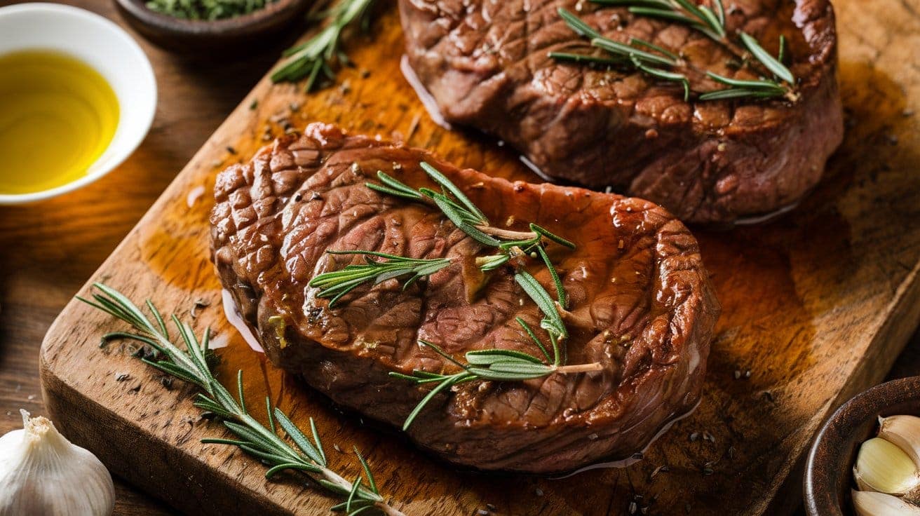 In a small bowl, mix together olive oil, minced garlic, rosemary, thyme, salt, and pepper. Rub this marinade evenly over both sides of the steaks. Let the steaks marinate for at least 30 minutes (or up to 2 hours) in the fridge for maximum flavor.