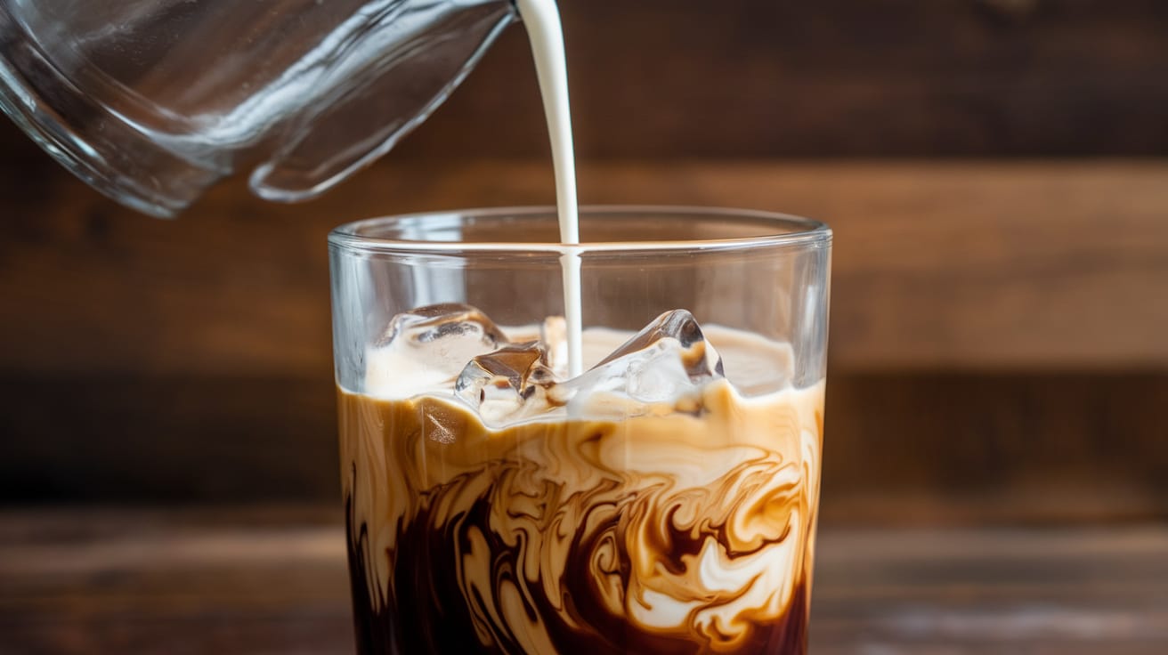 Pour ½ cup of milk over the coffee mixture. Use regular milk, almond milk, oat milk, or any preferred option.