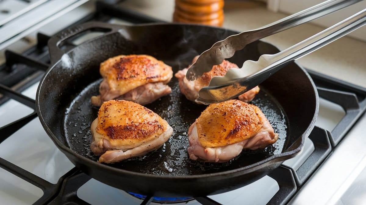 Heat olive oil in a skillet over medium-high heat. Place the chicken thighs skin-side down and cook for 5-7 minutes until the skin is golden and crispy. Flip and cook for another 3 minutes. Remove and set aside.