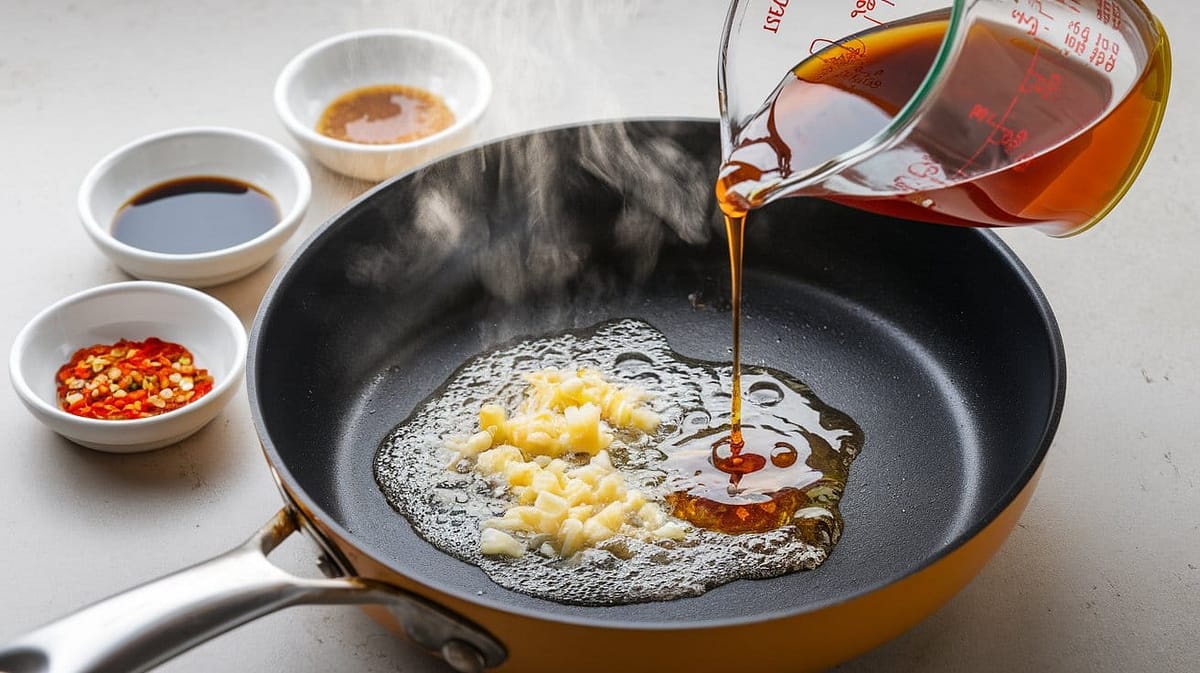 In the same skillet, melt butter over medium heat. Add minced garlic and sauté for 1-2 minutes until fragrant. Stir in honey, soy sauce, chili flakes, and vinegar. Simmer for 3 minutes until thickened slightly.