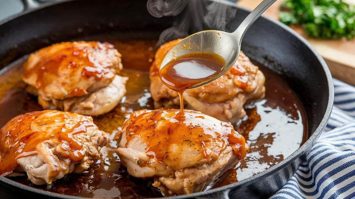 Return the chicken thighs to the skillet, spoon the sauce over them, and simmer for 10 minutes on low heat until the chicken is cooked through (internal temperature 75°C/165°F).