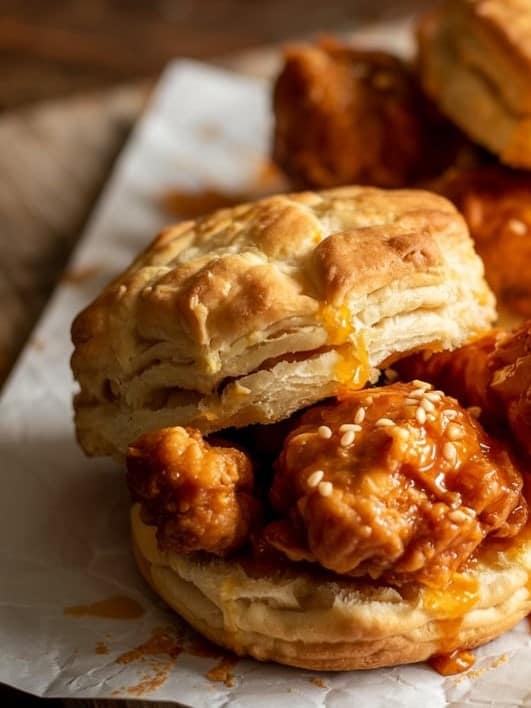 Slice each warm biscuit in half. Place a crispy chicken piece between the layers. Drizzle generously with hot honey. Serve immediately to enjoy the perfect contrast of sweet, spicy, and buttery.