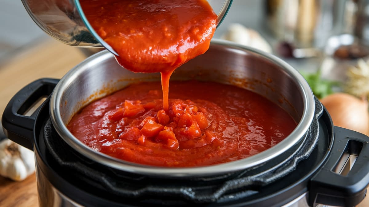 Add crushed tomatoes, diced tomatoes, beef broth, and balsamic vinegar, stirring well to deglaze the pot.
