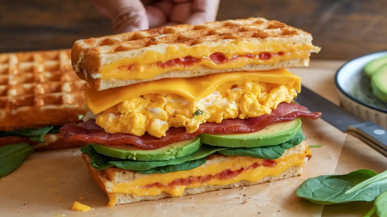 Once the first chaffle is cooked, remove it from the maker and place a slice of cheddar cheese on top while it's still warm to allow it to melt slightly. Add a layer of scrambled eggs, crispy bacon, sliced avocado, and fresh spinach leaves. Spread the creamy mayo-Dijon mixture on the second chaffle and place it on top to complete the sandwich.