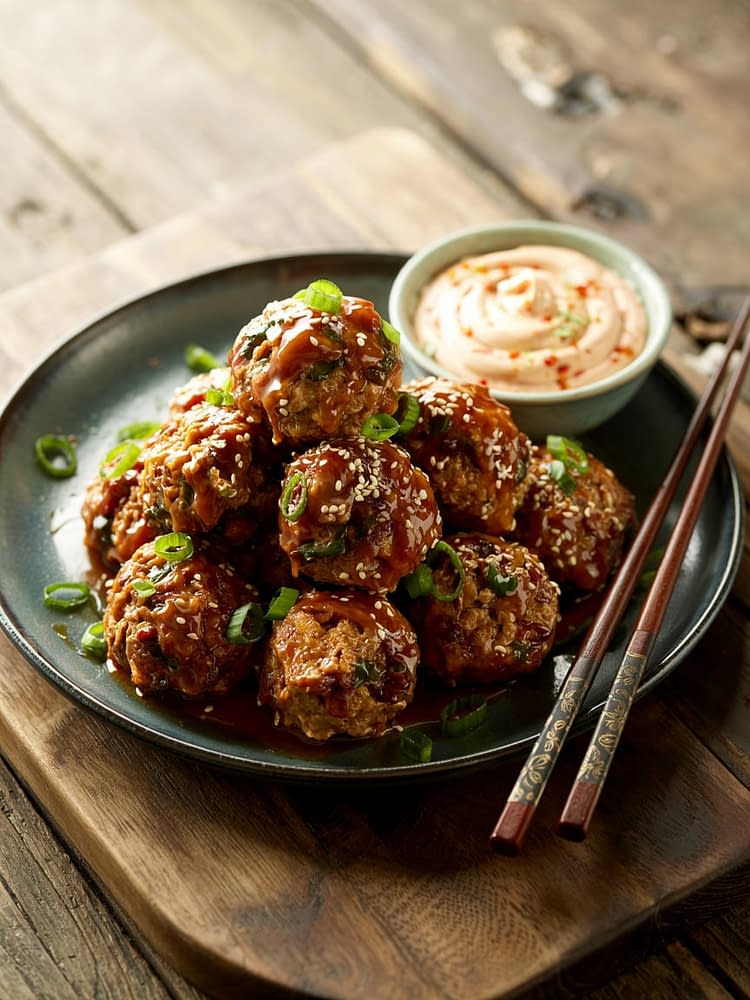 Arrange the glazed meatballs on a platter, drizzle extra glaze over the top, and garnish with sesame seeds and green onions. Serve warm with the spicy mayo dip on the side.