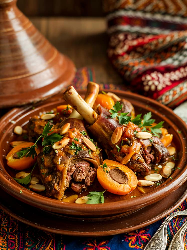 The tagine itself is more than just a dish—it’s a culinary tradition. In Moroccan culture, tagines represent warmth, hospitality, and shared meals. This particular version, featuring lamb shanks paired with dried apricots and toasted almonds, offers a delightful balance of savory and sweet. It’s luxurious enough for festive gatherings yet simple enough to enjoy as a family dinner during colder months.