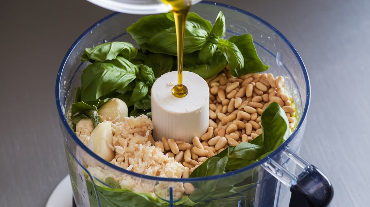 In a food processor, add 2 cups fresh basil leaves, toasted pine nuts, 2 minced garlic cloves, and ½ cup grated Parmesan cheese.