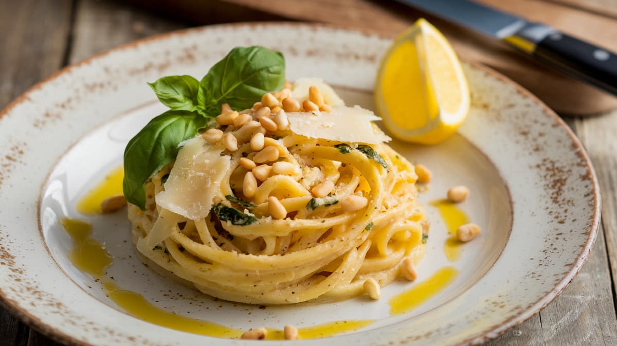 Top with shaved Parmesan cheese, toasted pine nuts, fresh basil leaves, and a squeeze of fresh lemon juice.