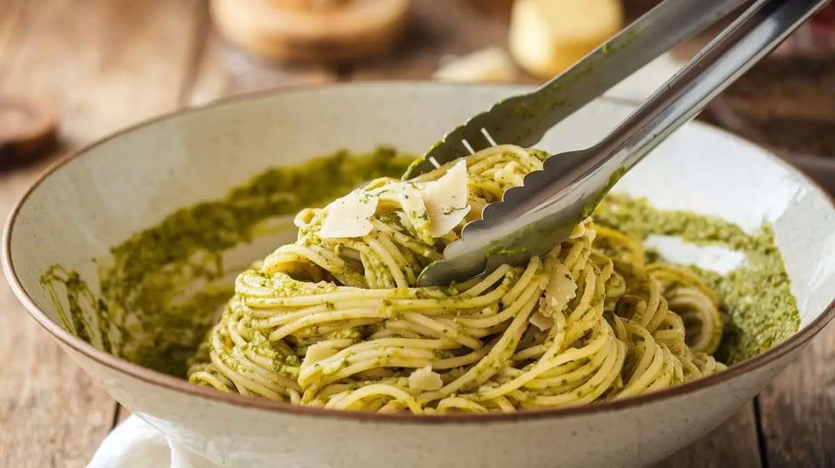 In a large mixing bowl, toss the cooked pasta with the lemon basil pesto.