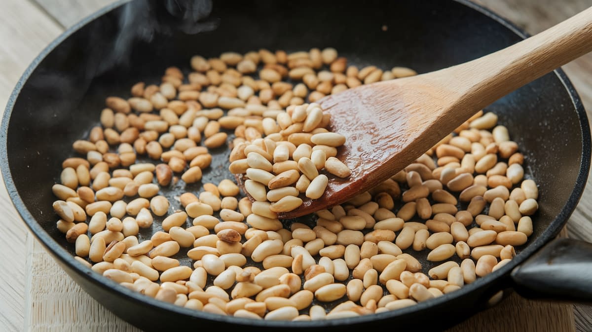 In a dry skillet over medium heat, add ⅓ cup pine nuts and toast for 2-3 minutes until golden brown and fragrant.