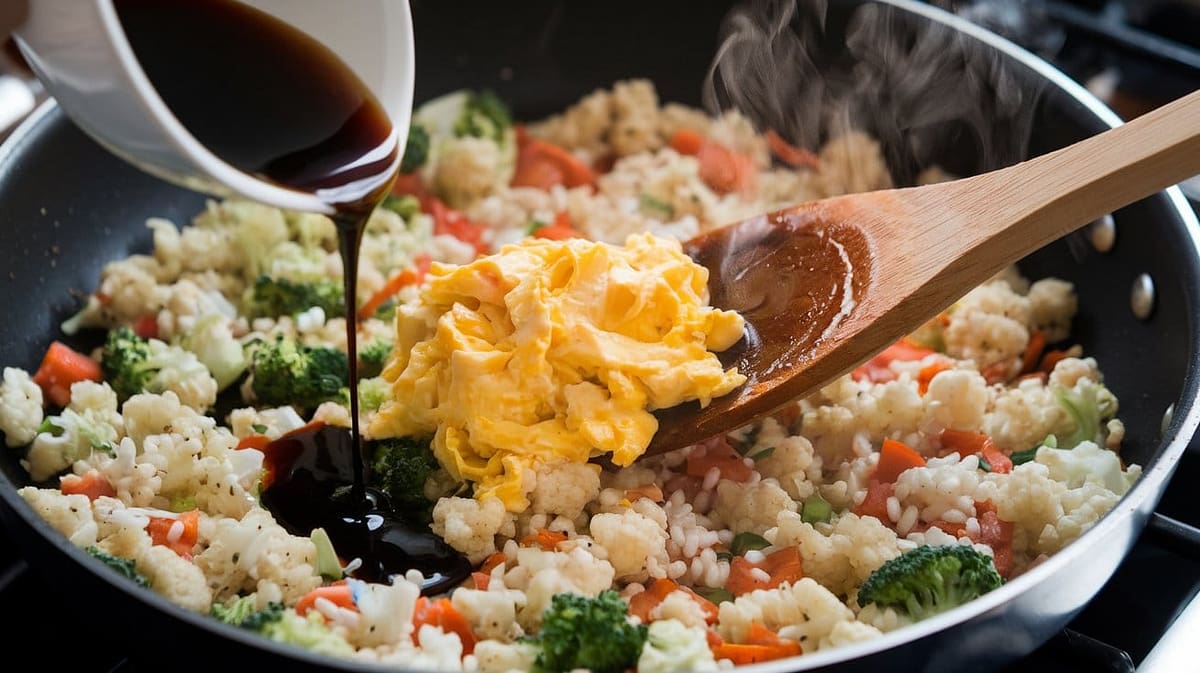 Push the vegetables to one side of the skillet and add the riced cauliflower. Stir well and cook for 3–4 minutes until slightly tender. Avoid overcooki