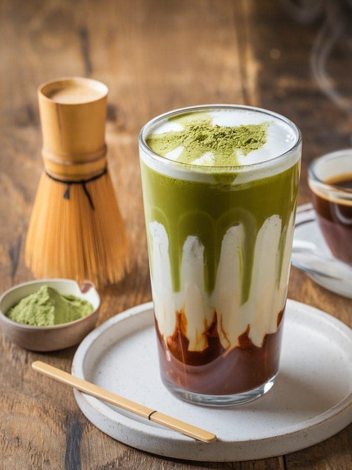 - Iced Matcha Coffee Latte – Use chilled coffee and matcha, then serve over ice.