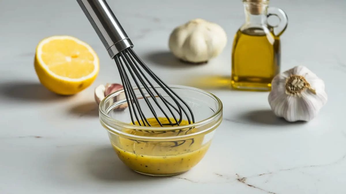 In a small bowl, whisk together olive oil, lemon juice, Dijon mustard, minced garlic, salt, and pepper until emulsified.