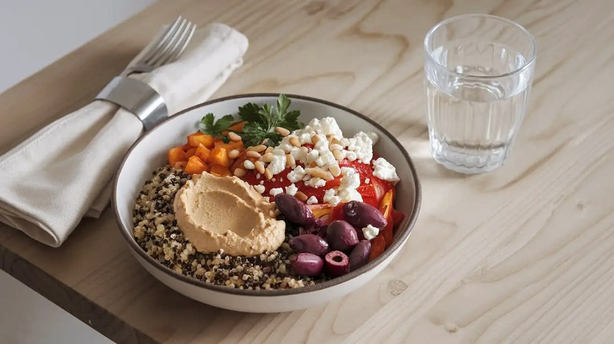 Divide the cooked quinoa among four bowls. Top each bowl with roasted vegetables, feta, olives, a dollop of hummus, and a sprinkle of parsley and pine nuts. Drizzle with the prepared dressing.