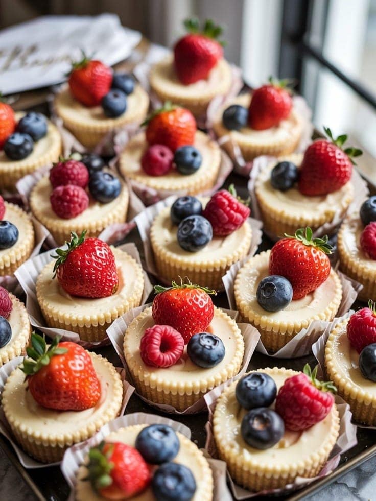 Before serving, top each mini cheesecake with a mix of fresh strawberries, blueberries, and raspberries. Brush lightly with honey or fruit glaze for a bakery-style finish.