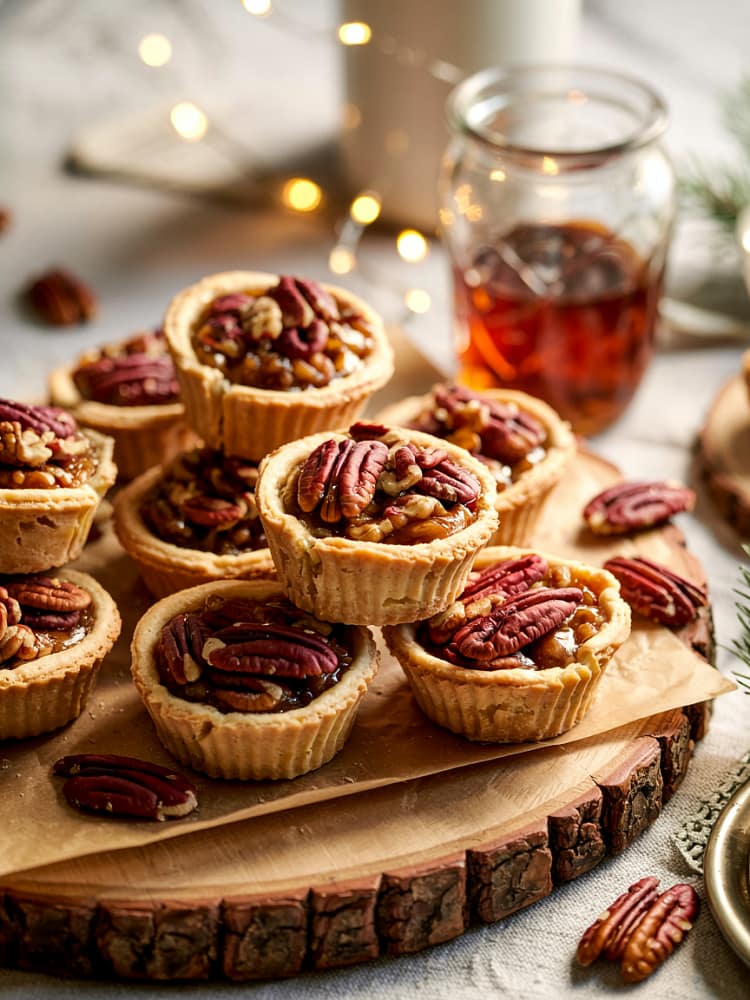 Top cooled pecan tassies with a small dollop of vanilla maple butter for a glossy finish and extra flavor boost. Serve warm or at room temperature.