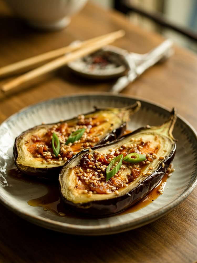 For a more indulgent presentation, serve the eggplant with a light sprinkling of crushed peanuts or a drizzle of chili oil for a spicy-sweet kick.