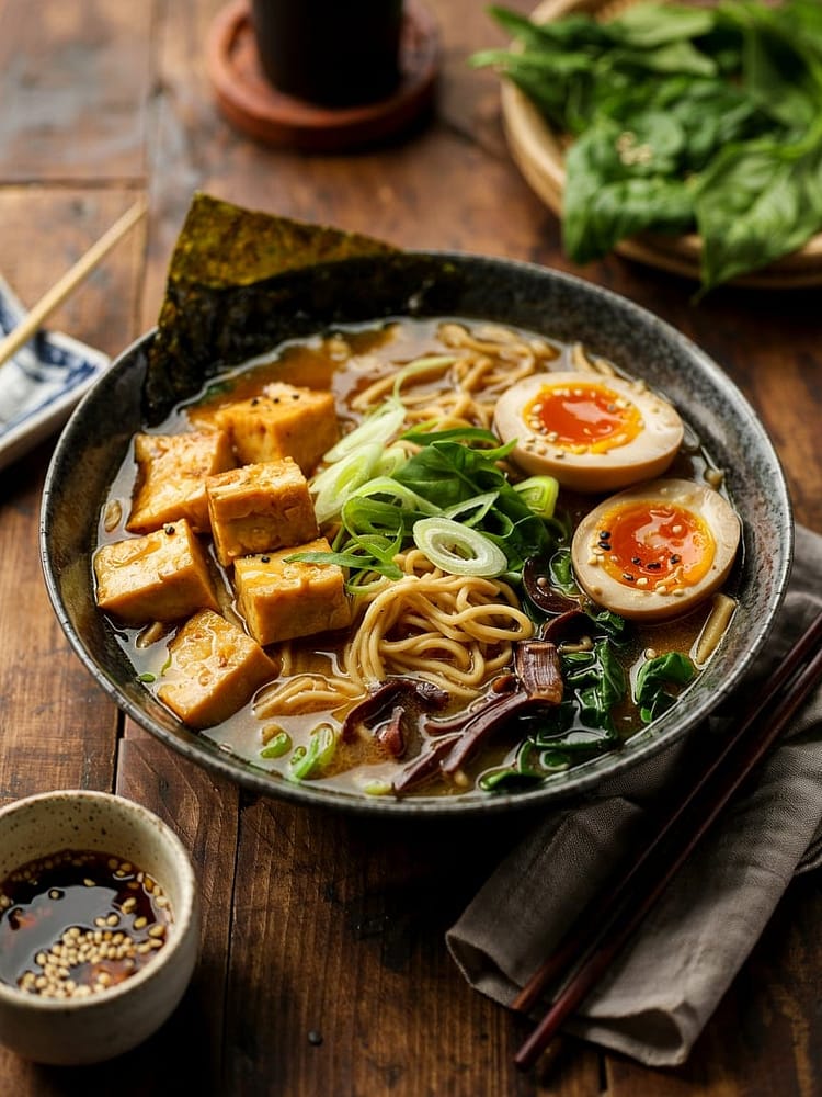 This savory Mushroom Miso Ramen with Crispy Tofu is a comforting, plant-based noodle soup packed with umami flavors. Featuring a rich miso-mushroom broth, chewy ramen noodles, crispy golden tofu, and fresh toppings, this dish is a soul-warming bowl perfect for chilly days or meatless meals.