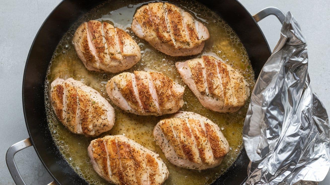 Arrange the coated chicken breasts in the prepared skillet or baking dish. Pour chicken broth or water around the chicken to keep it moist. Cover the pan loosely with aluminum foil.