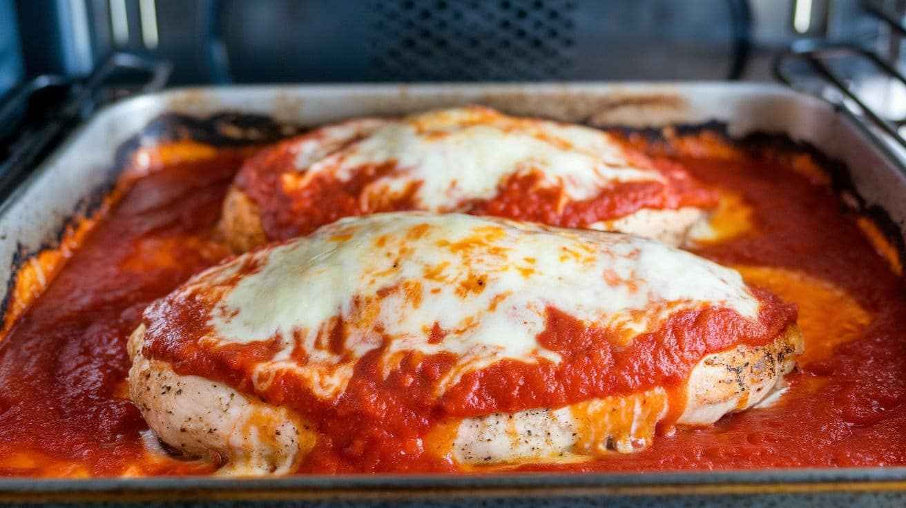Once the chicken is cooked through, remove the pan from the oven. Spoon marinara sauce over each chicken breast, then sprinkle a generous amount of shredded mozzarella cheese on top. Return the pan to the oven and bake for an additional 5–7 minutes, or until the cheese is melted and bubbly.