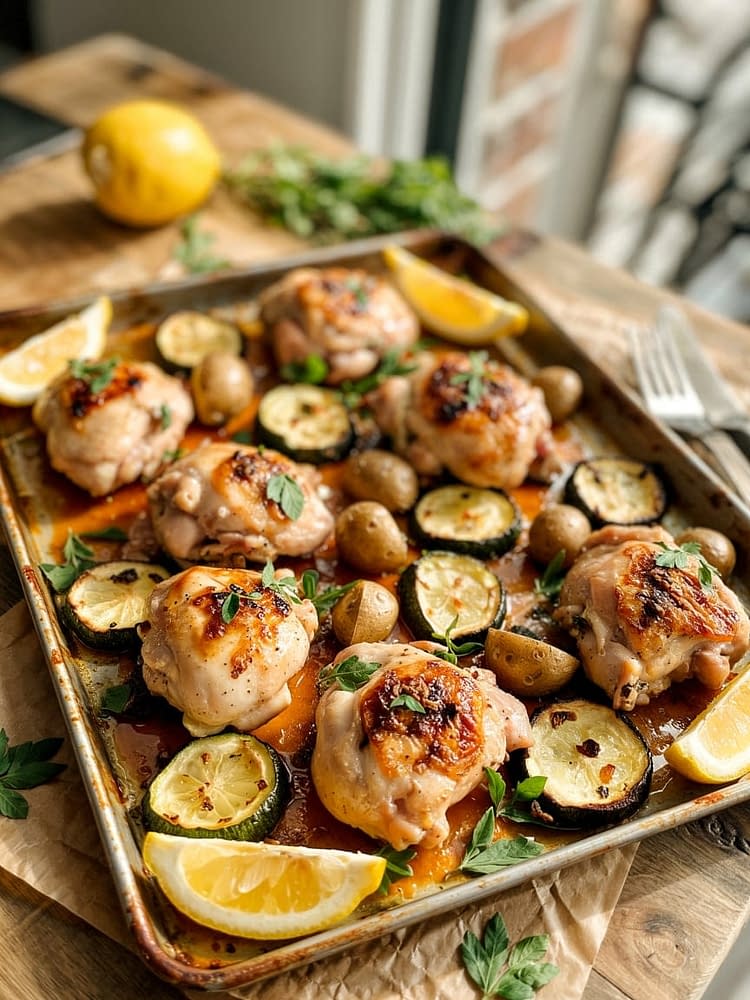 This One-Pan Lemon Herb Chicken with Potatoes & Zucchini is a wholesome, easy-to-make weeknight dinner packed with vibrant flavors. Juicy chicken thighs are roasted with golden baby potatoes and tender zucchini, all infused with fresh herbs and zesty lemon. A healthy, minimal-cleanup dish perfect for busy families or meal preppers.