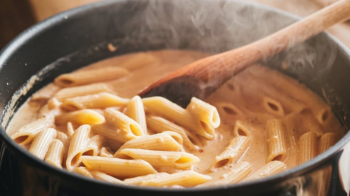 Add pasta to the pot and ensure it’s submerged in the liquid. Cook for 10–12 minutes, stirring occasionally, until the pasta is al dente and the liquid has reduced to form a creamy sauce.