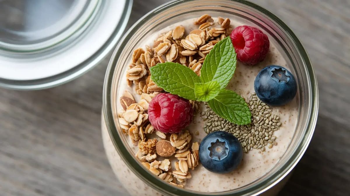 In the morning, give the oats a good stir. Top with granola, almond butter, hemp seeds, and any optional toppings like fresh mint, a drizzle of honey, or a sprinkle of cinnamon. Serve chilled and enjoy a hearty, superfood-packed breakfast.